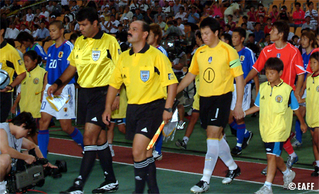 The teams entering the pitch. Lee Woon Jae (KOR) and Tsuboi (JPN) lead their teams as captain.