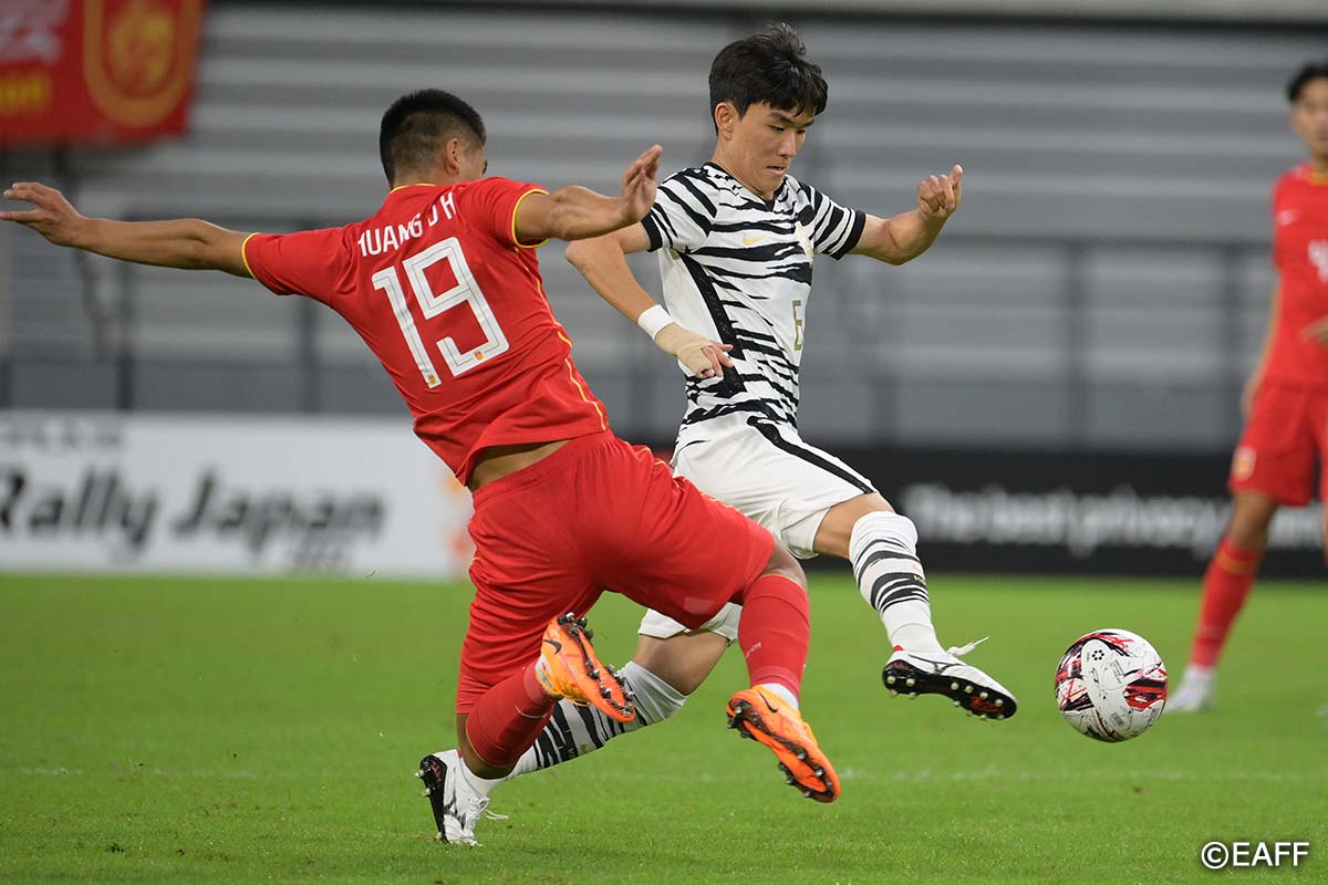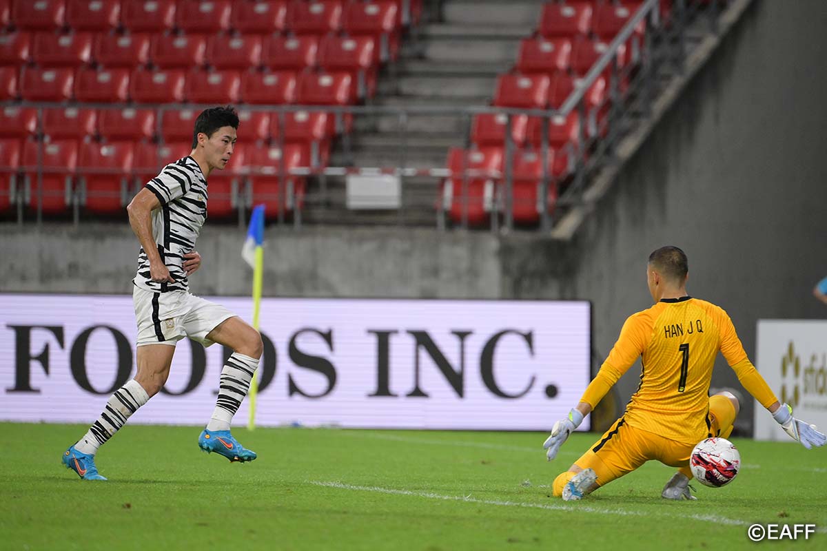 Both sides put up a fierce struggle for possession right from the start. In the 10th minute, Korea Rep. NA, SANGHO advanced the ball near the penalty area and fired a shot directly at the far left side of the goal, but was denied by China PR goalkeeper HAN JIAQI. NA, SANGHO’s teammate HWANG, INBEOM put a long shot on goal at the 22-minute mark, but was likewise stopped by HAN JIAQI’s skilled net-minding.